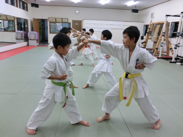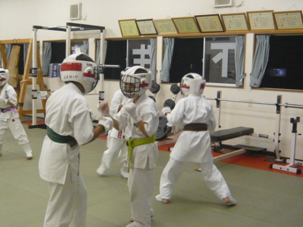 少年部の稽古は基本稽古後、移動稽古、型稽古、そして最後にスパーリングを指導しました。
